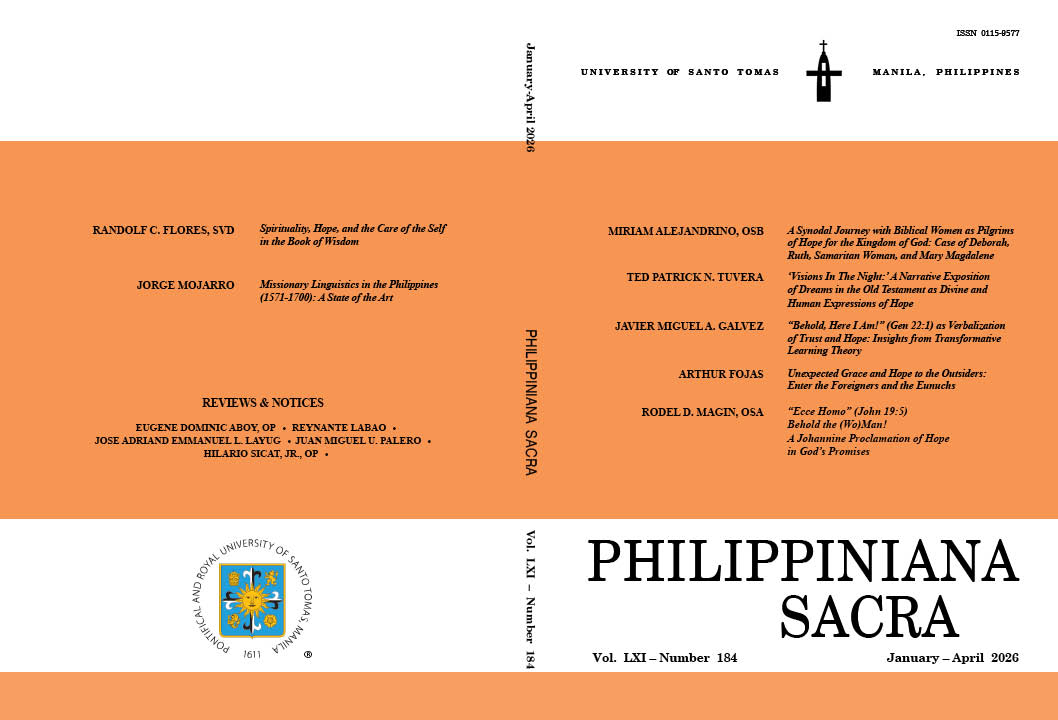 In 1521, Ferdinand Magellan brought three religious images to the Philippines, including the Ecce Homo, a half-relief wooden sculpture depicting the upper torso and head of Jesus Christ. Despite persistent efforts to promote its veneration, the Ecce Homo has not achieved the widespread popularity of the Sto. Niño de Cebu. This study undertakes a critical re-examination of the Ecce Homo, focusing on its scriptural context within the Passion narrative in John 18-19. Specifically, it analyzes Pilate’s pronouncement Ecce Homo in John 19:5 to elucidate its profound significance within the Johannine Christological narrative. Moreover, this article demonstrates a compelling connection between the phrase’s meaning and the Old Testament concept of a God who actively champions the marginalized and impoverished.